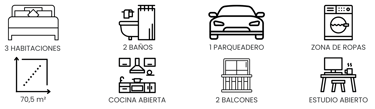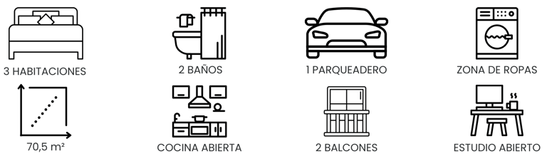 La zona privada ofrece tres habitaciones bien distribuidas, incluyendo una habitación principal con walking closet y baño privado. Además, cuenta con estudio independiente con acceso a un segundo balcón, ideal para trabajar desde casa, y baño auxiliar completo para las habitaciones secundarias. Los acabados contemporáneos, los pisos en madera laminada y la ventilación natural en todos los espacios refuerzan la sensación de comodidad y bienestar.