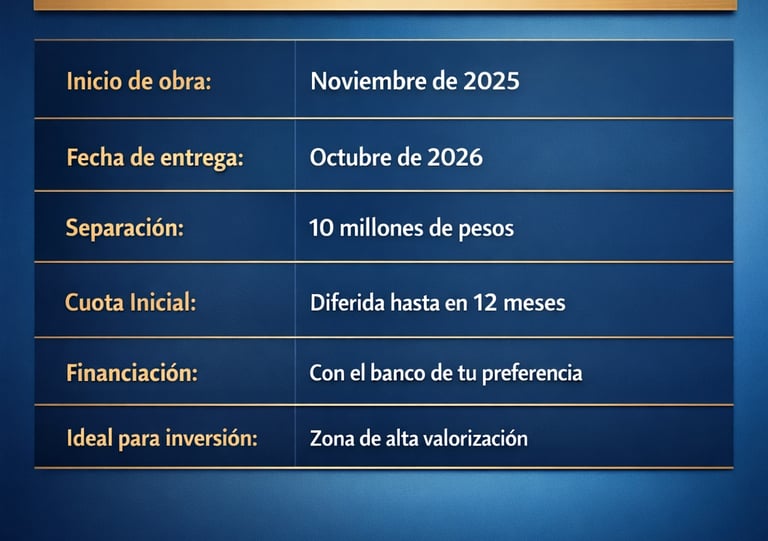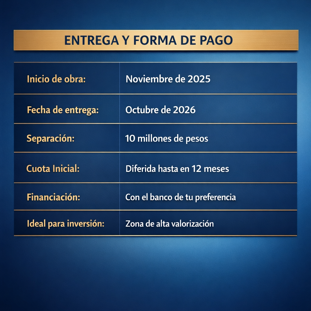 Actualmente el proyecto inició su etapa de construcción en Junio de 2025 y contempla como fecha de entrega el mes de Octubre de 2026.