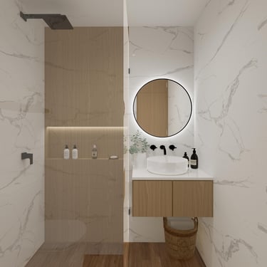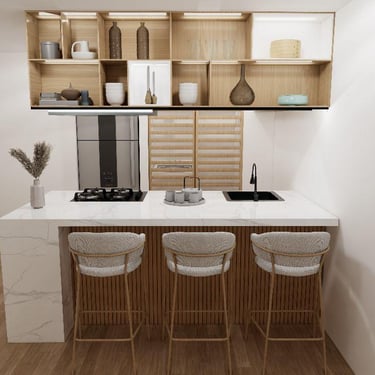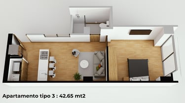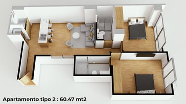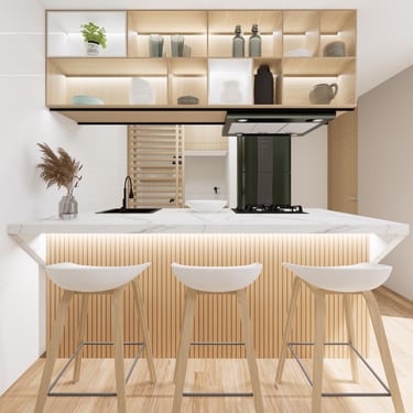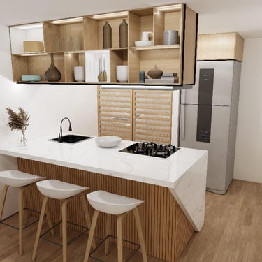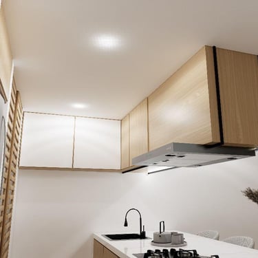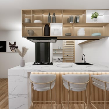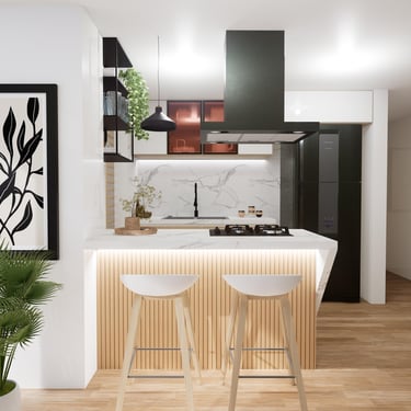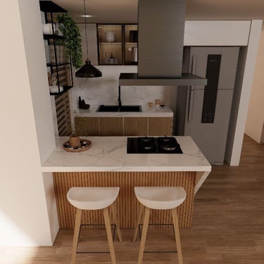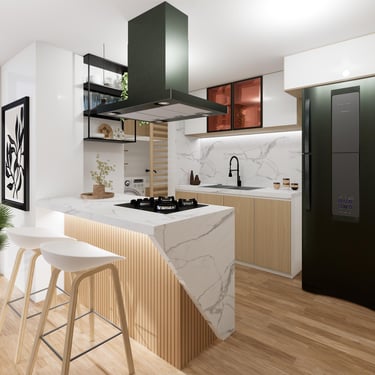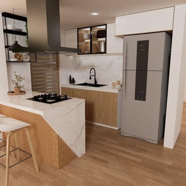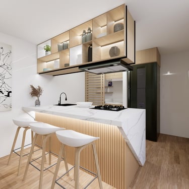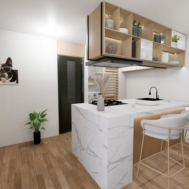 Cada detalle fue pensado para que disfrutes tu hogar desde el primer día: una cocina con mesón en piedra sinterizada color Calacatta, salpicaderos en porcelanato blanco de gran formato, puertas en aluminio negro, griferías en negro mate y pisos SPC, resistentes y fáciles de mantener, que hacen del día a día una experiencia cómoda y agradable.