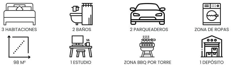 Disponen de parqueadero doble en línea, depósito independiente y acceso a una zona verde con terraza BBQ exclusiva por torre. Además, cada piso cuenta con un solo apartamento, lo que garantiza mayor privacidad.