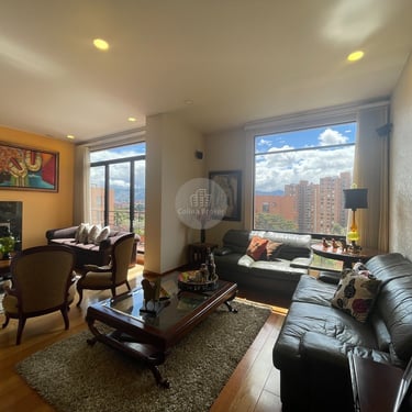 Su zona social destaca por una sala amplia de tres ambientes con chimeneas, comedor independiente y una cocina completamente dotada con isla central, comedor auxiliar, zona de ropas independiente y alcoba de servicio con baño privado. El apartamento está rodeado por terrazas en los costados, ideales para disfrutar del entorno natural.